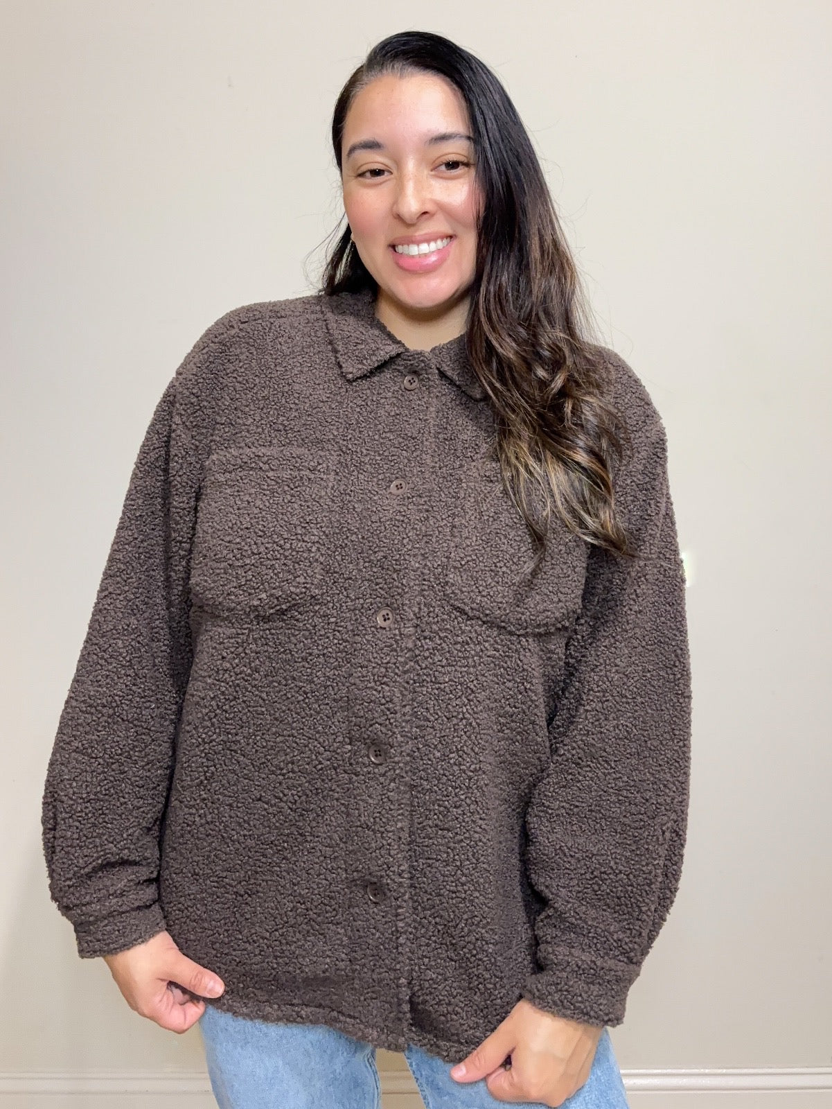 Wrap yourself in cozy perfection with our Cocoa Cloud Teddy Shacket! This ultra-soft, teddy-textured button-up features a relaxed fit, functional chest pockets, and that effortless oversized look we all love. Perfect for layering over your favorite tees or knits during chilly days. Pair it with jeans or leggings for that comfy-cute fall vibe.